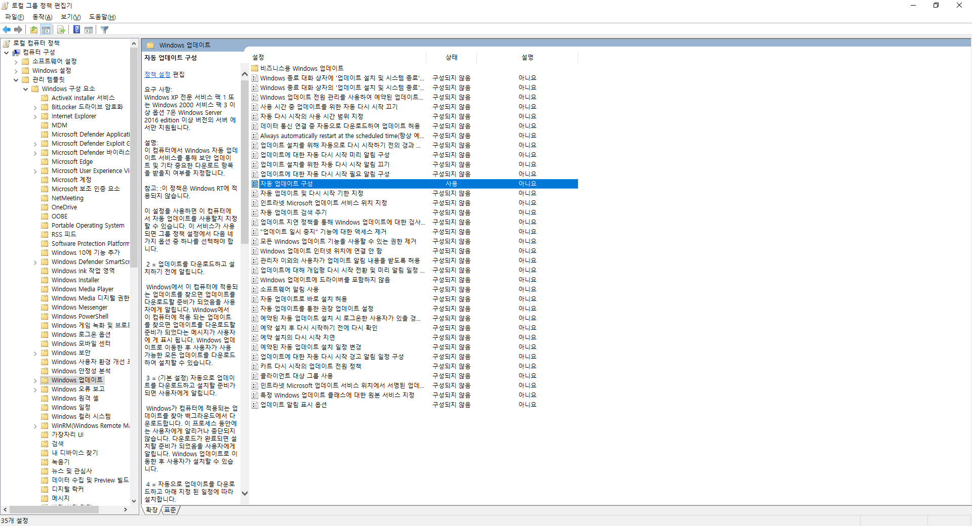 win키+r -> gpedit.msc -> 관리 템플릿 -> Windows 구성 요소 -> Windows 업데이트 -> 자동 업데이트 구성 -> 사용(2- 다운로드 및 자동 설치 알림)