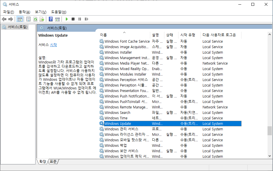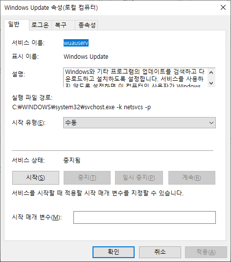 win키 -> '서비스' 검색 -> Windows Update -> 시작유형(수동)