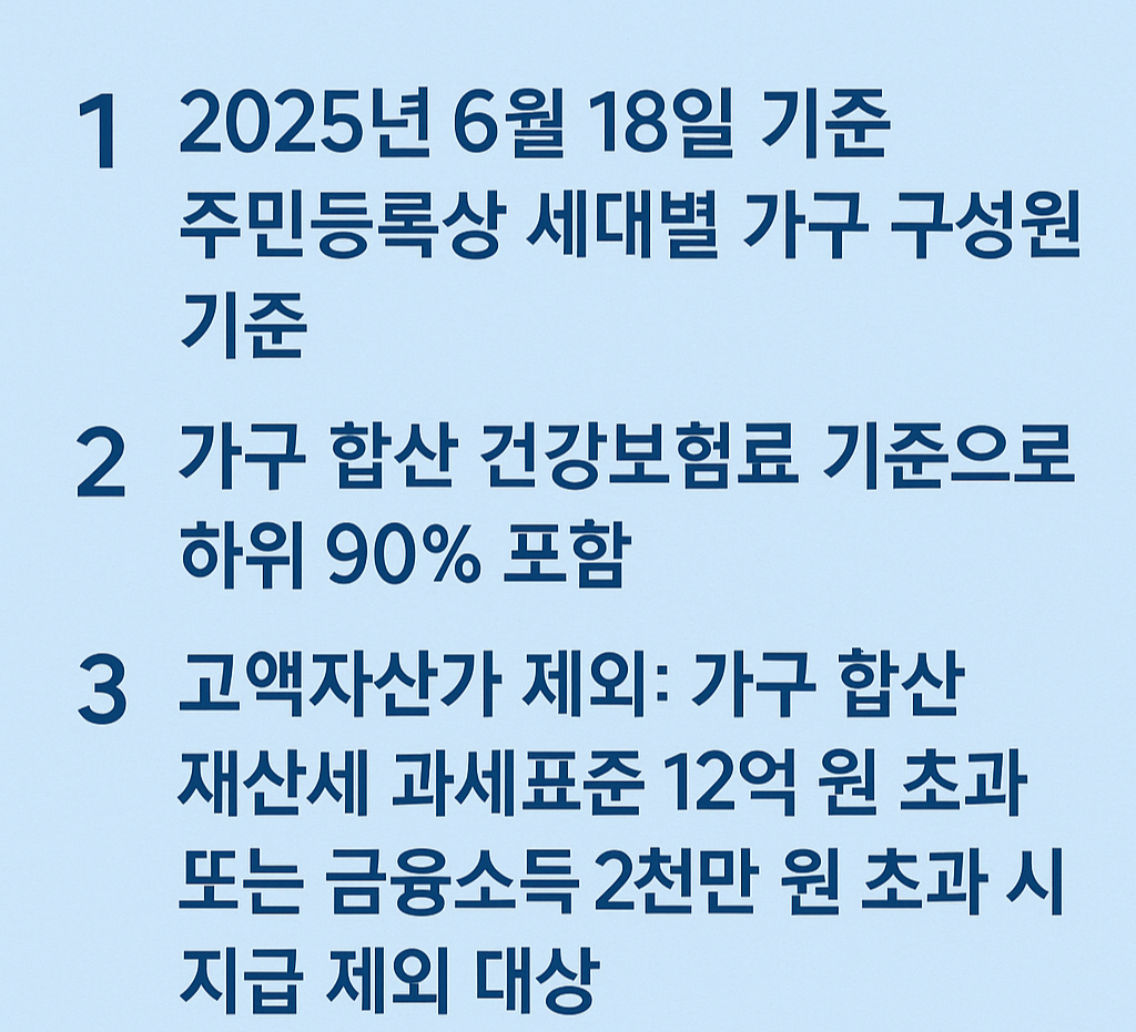 - 고액자산가 제외: 가구 합산 재산세 과세표준 12억 원 초과 또는 금융소득 2천만 원 초과 시 지급 제외 대상